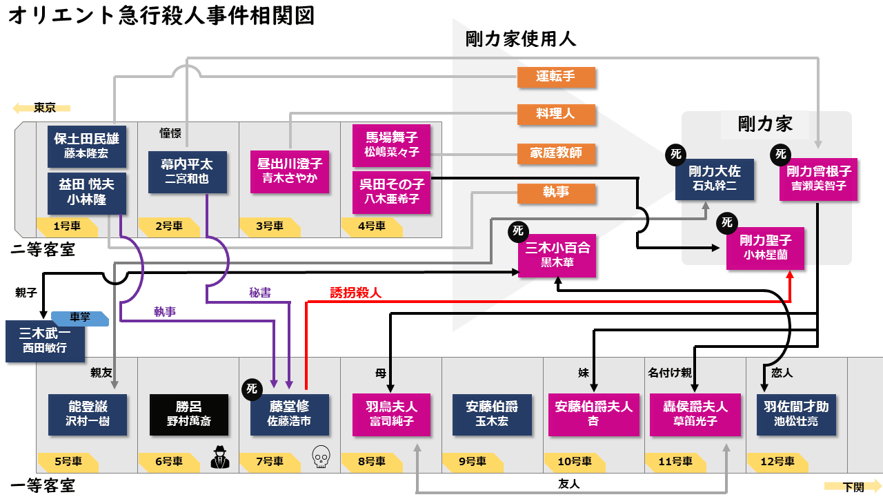 登場人物の関係を下の画像のようにまとめました。真相が明らかになった後の相関図となっています。相関図は特急東洋の乗客が、どのように剛力家と繋がっていたかをまとめたような内容となっています。