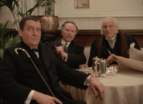 ことの成り行きを見守るホームズ兄弟とワトソン博士。この後三人は牡蠣を食べに行く。