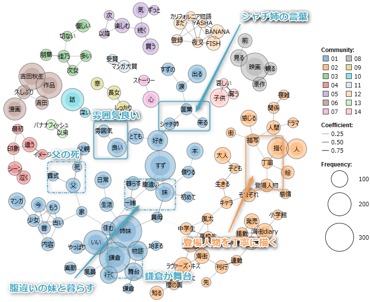 丁寧という言葉を中心に、登場人物や描写、描くという言葉が結びついており、登場人物を丁寧に描いたという内容の感想が多いです。絵自体ももちろん丁寧なのですが、どちらかというと、人物の感情や日常の描き方が丁寧という意味です - 雰囲気良い