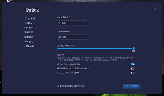 BlueStacksの設定も多少は変更できますが、トラブルが解消しない場合は、メモリー増強、PC買い替えなどが必要となります。