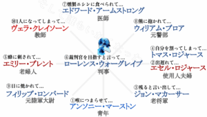 島に集められた10人ついてまとめます。名前の上にある①喉につまらせて…などの文についてですが、①は死亡した順番を意味しています。番号の後ろに続く一文は、童謡の一部を抜粋しています。